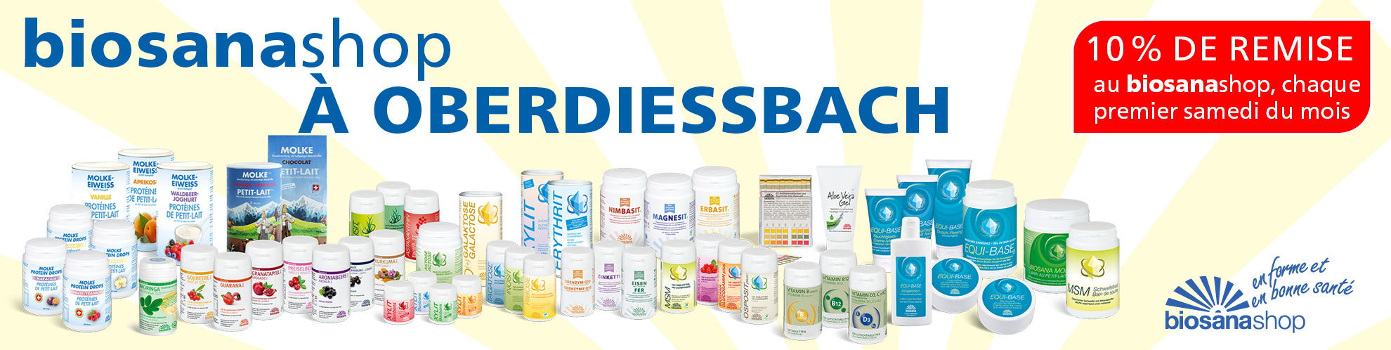 Dans notre boutique «biosanashop» dans le centre «Oberdiessbach Nord», vous trouverez une vaste sélection de compléments alimentaires et de produits cosmétiques naturels que nous fabriquons dans notre entreprise familiale d’Oberdiessbach, ainsi que d’autres articles qui viennent compléter la gamme.